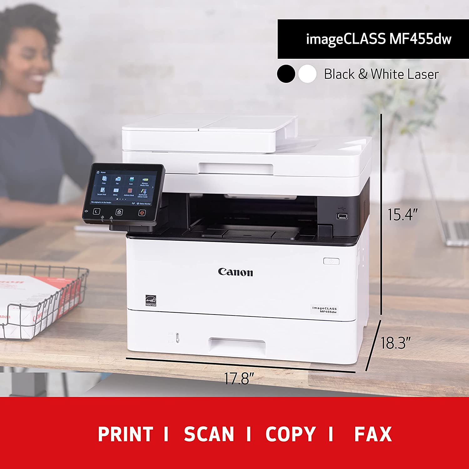 Canon imageCLASS MF455dw Wireless Laser Multifunction Printer - Monochrome - White - Copier/Fax/Printer/Scanner - 40 ppm Mono Print - 600 x 600 dpi Print - Automatic Duplex Print - Color Flatbed Scanner - 600 dpi Optical Scan - Monochrome Fax - Gigabit Ethernet Ethernet - Wireless LAN - Wi-Fi Direct, Apple AirPrint, Canon PRINT Business, Mopria Print Service - USB - 1 Each - For Plain Paper Print