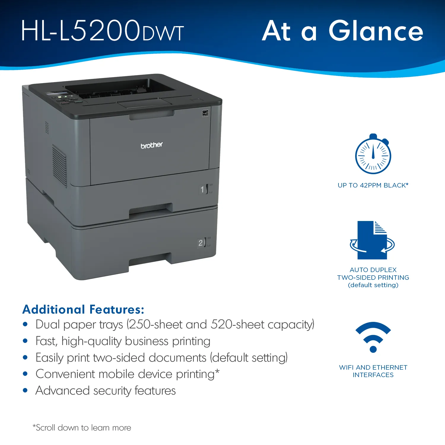 Brother Business Laser Printer HL-L5200DWT - Monochrome - Duplex Printing - Laser Printer - 42ppm - Up to 1200 x 1200 dpi - Wireless - Ethernet - Hi-Speed USB 2.0